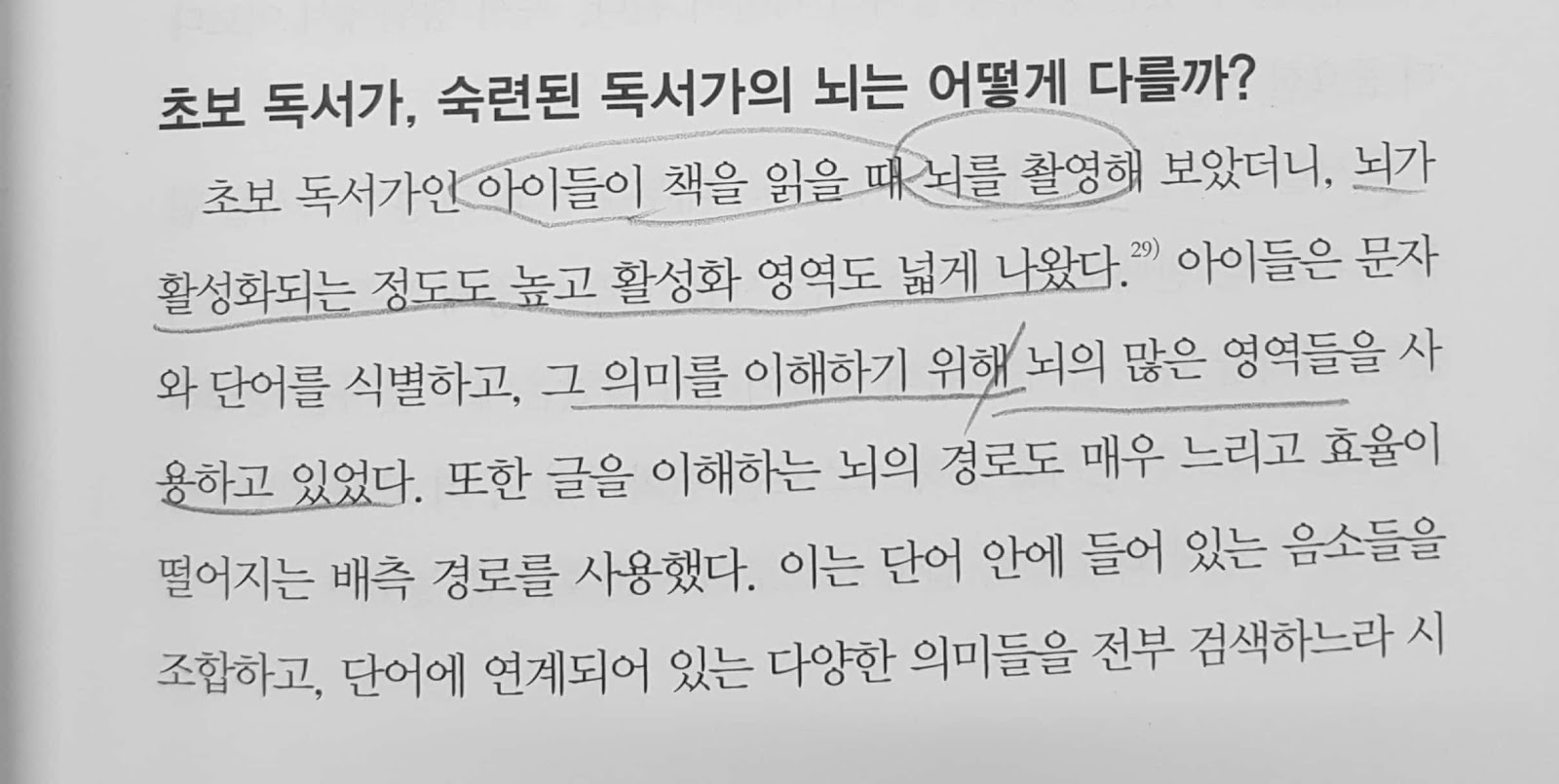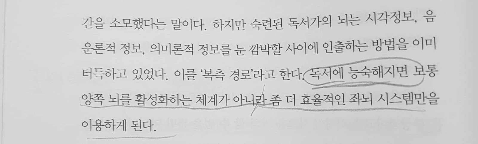 독서에 능숙해지면 보통 양쪽 뇌를 활성화하는 체계가 아니라좀 더 효율적인 좌뇌 시스템만을 이용하게 된다.